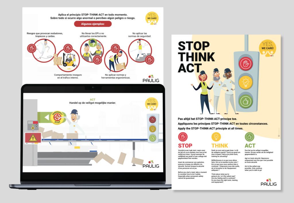 Paulig schakelde DENKie ook in voor een veiligheidscampagne rond het STOP-THINK-ACT-principe. In twee animatievideo’s (een korte en een uitgebreide versie) leggen we het principe helder uit en illustreren we enkele herkenbare voorbeelden bij Paulig. Dit principe werd ook verwerkt in de safety games en vormt de rode draad in elke campagne die we voor Paulig uitwerken.