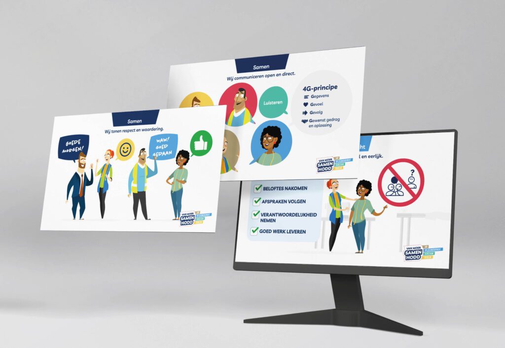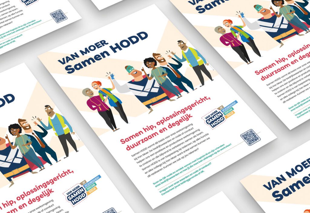 We werkten een animatievideo uit waarin de bedrijfswaarden en de “code of conduct” van Van Moer centraal staan. Deze waarden werden gebundeld onder één herkenbaar label: Samen HODD (Hip, Oplossingsgericht, Duurzaam en Degelijk). Het label vat de identiteit van Van Moer kernachtig samen en vormt een positieve houvast voor alle medewerkers.